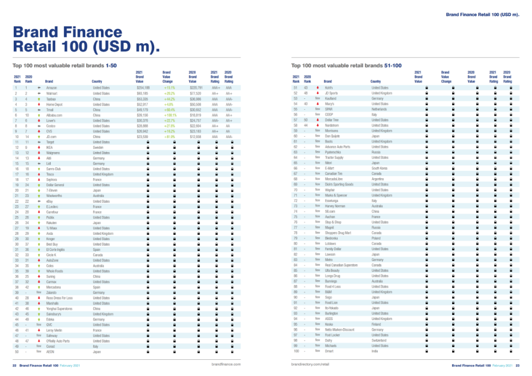 本文信息来源:brandirectory.com与《Retail 100 2021》报告。